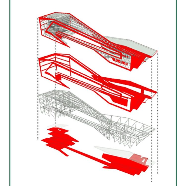 سازه این بنا به صورت نمایان و اکسپوز است و سازههای خرپایی را شاهد هستیم که در برخی فضاها، با ورقهای فلزی پوشانده شدهاند. در اغلب بخشها ولی سازه به تنهایی شکل دهنده فضاست و از معماری جدا نیست.